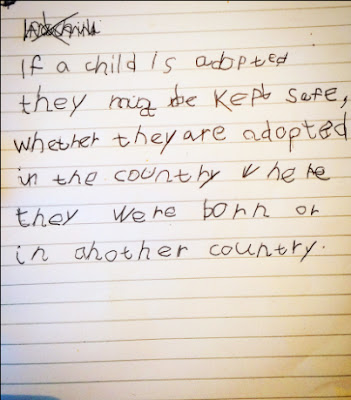 As a recent piece of homework Noah had to respond to one of Unicef's documented children's rights - the one about adoption seemed fitting.. This is our family.